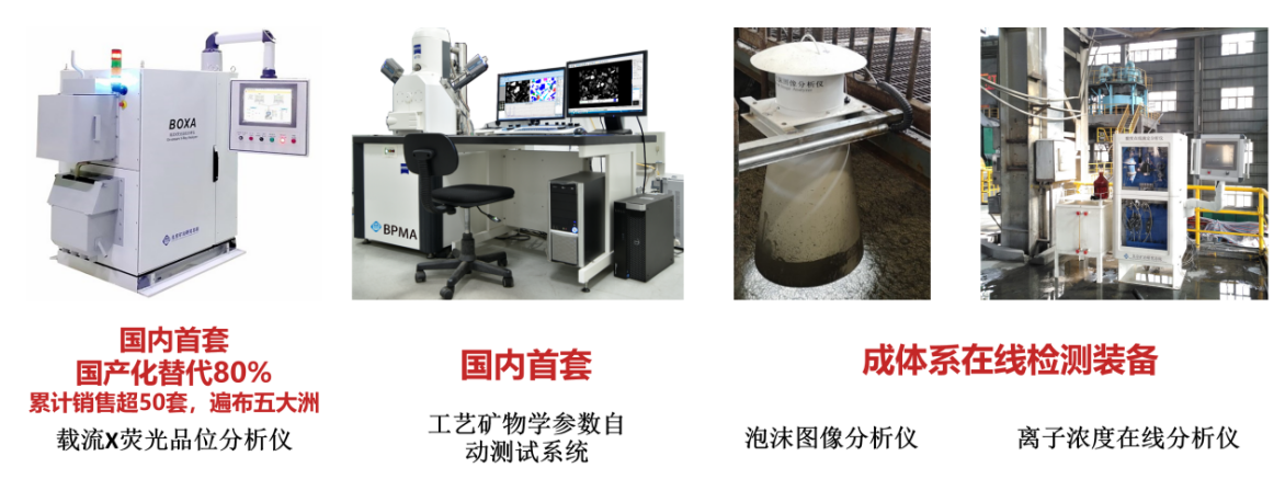 BASS取樣器:適用于粉末、礦漿、溶液等不同類型的二相/多相流取樣,設(shè)計(jì)各種不同類型的取樣縮分系統(tǒng),可用于流程金屬平衡考察及載流分析儀瞬時(shí)金屬平衡分析。BOXA載流X熒光分析儀:在銅鉛鋅鐵鉬等關(guān)鍵性金屬礦漿在線分析中起到重要作用,1σ相對(duì)精度為2%~4%(高品位)、3%~6%(低品位)。BPSM粒度分析儀:可最多測(cè)量4個(gè)流道,1σ絕對(duì)精度1%~2%,同時(shí)具有濃度測(cè)量功能。BOTA離子濃度分析儀:用于pH測(cè)量時(shí),測(cè)量精度0.05pH,適用于石灰閉環(huán)控制。BOSA礦石塊度圖像分析儀:可對(duì)全粒級(jí)礦物F50-F80、F100含量進(jìn)行檢測(cè),同時(shí)可以對(duì)最終的給料塊度進(jìn)行計(jì)算合成,適配于BPM-G磨礦專家系統(tǒng)。BFIPS泡沫圖像分析儀:可對(duì)泡沫大小、顏色、流速、生存時(shí)間檢測(cè),并提供相對(duì)礦化程度(RMD)分析,適配于BPM-F浮選專家系統(tǒng)。