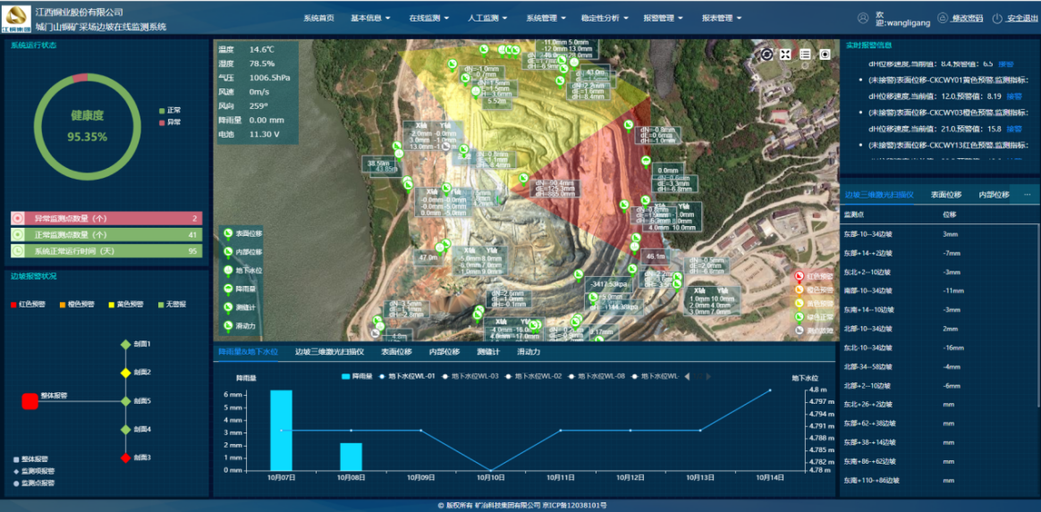 目前,該技術(shù)已在城門(mén)山銅礦、黑龍江多寶山銅礦、西藏巨龍銅礦等多個(gè)大型露天礦山進(jìn)行了應(yīng)用。上述礦山采用邊坡雷達(dá)(GNSS、三維激光掃描儀)進(jìn)行表面位移監(jiān)測(cè),同時(shí)對(duì)內(nèi)部位移、降雨量、地下水位等進(jìn)行了監(jiān)測(cè),通過(guò)應(yīng)用該技術(shù),將礦山邊坡穩(wěn)定性實(shí)時(shí)分析與各項(xiàng)監(jiān)測(cè)項(xiàng)目相結(jié)合,實(shí)現(xiàn)了邊坡穩(wěn)定性精準(zhǔn)預(yù)警,尤其是在汛期、凍融期,成功預(yù)警了多次局部邊坡坍塌情況,有力保障了礦山安全生產(chǎn)工作,避免了人員傷亡和機(jī)械設(shè)備、財(cái)產(chǎn)損失。